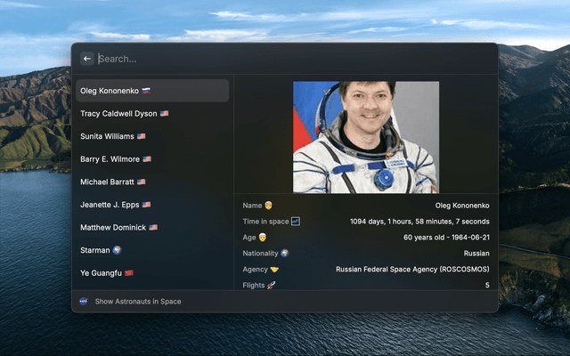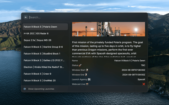 This Raycast extension allows you to view the Astronomy Picture of the Day, latest news, astronauts, spacecrafts, and upcoming launches from NASA and other space agencies.