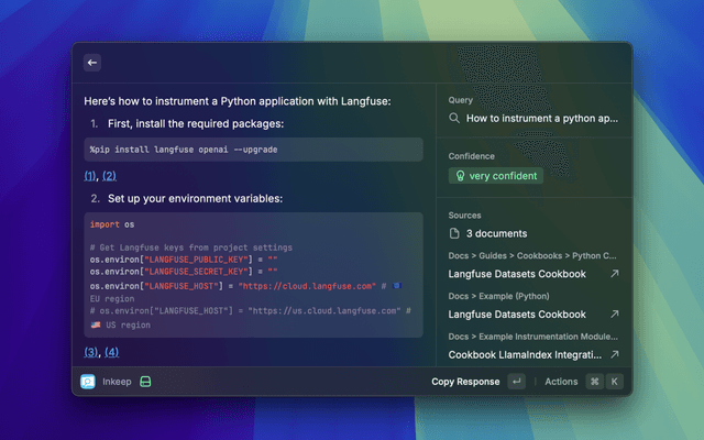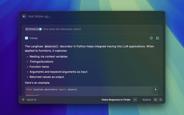 A Raycast extension for interacting with the Inkeep Completions API (docs). This extension allows you to ask questions and get AI-powered answers from your knowledge base.