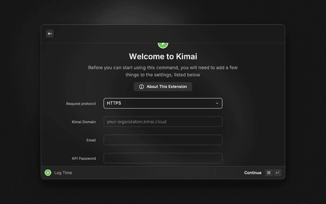 This Raycast extension lets you quickly add new time log to Kimai and view amount of hours logged today in menu bar.
