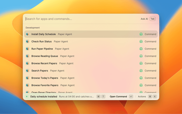 A Raycast extension for the Paper Agent workflow: run the pipeline, browse today’s and recent papers, search your library, manage favorites and a reading queue, and schedule daily runs on macOS.