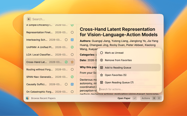 | Reading Queue | Papers you’ve queued for reading. Stored locally; same open/read/favorite actions. |