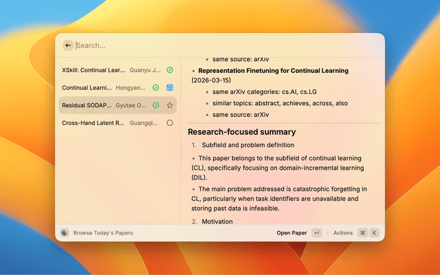 | Today Papers | Browse today’s papers from your local library. Detail view: title, authors, abstract, “Why this paper,” optional research summary. Actions: open paper/note, related papers, mark read, favorites, reading queue. |