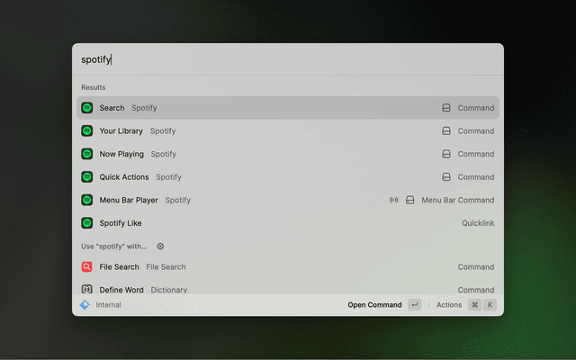 A single unified search command. Use this to search for artists, albums, songs, playlists, podcasts, and episodes. Use the dropdown menu to filter your search to a specific category. Each category offers contextual actions, so you can dive deeper into the search.