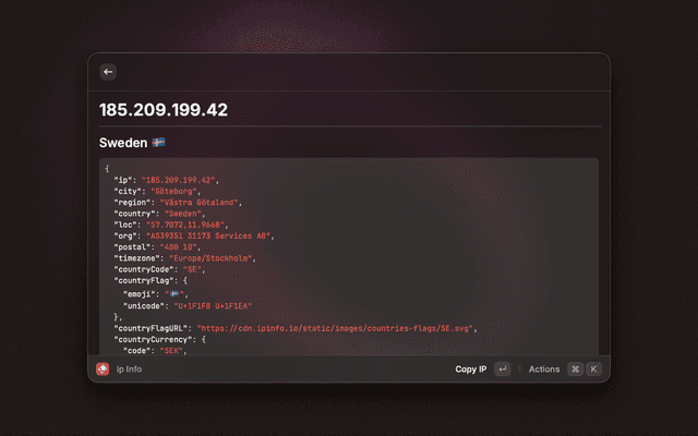 A Raycast extension to use ipinfo.io's API to get information about IP addresses.