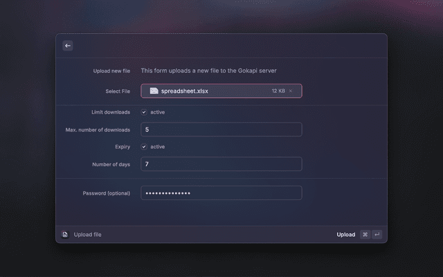 • Upload Files: Select a file from Finder and upload it to your Gokapi server.