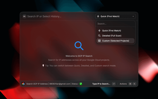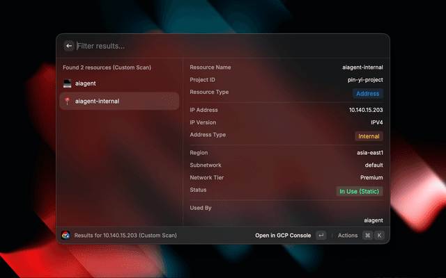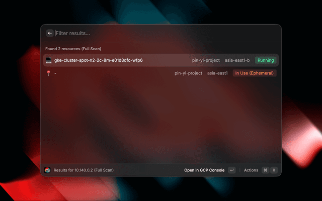 A Raycast extension to quickly search for IP addresses across all your Google Cloud Platform projects.