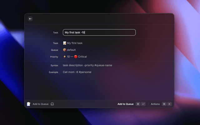 • Add to Queue: Quickly capture tasks with inline priority and queue syntax
