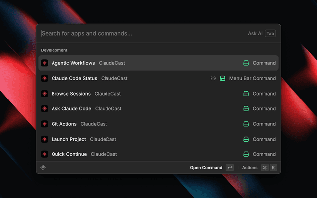 • Open Raycast → Search "ClaudeCast" → Press ⌘,