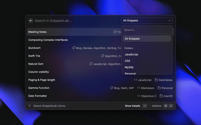 - Search for any snippet in your SnippetsLab library directly from Raycast.