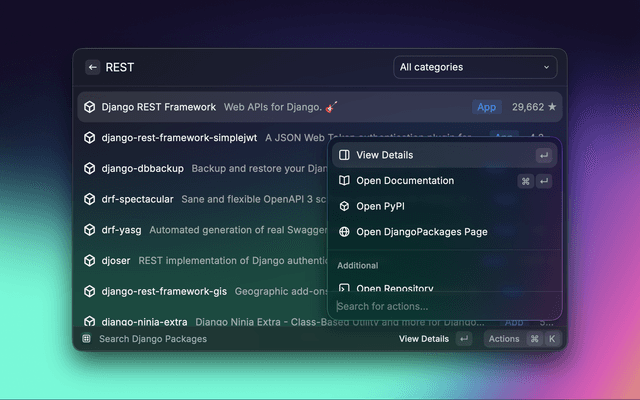 Explore djangopackages.org without leaving Raycast. Search packages, inspect metadata, and jump to docs, repos, or PyPI with a keystroke.
