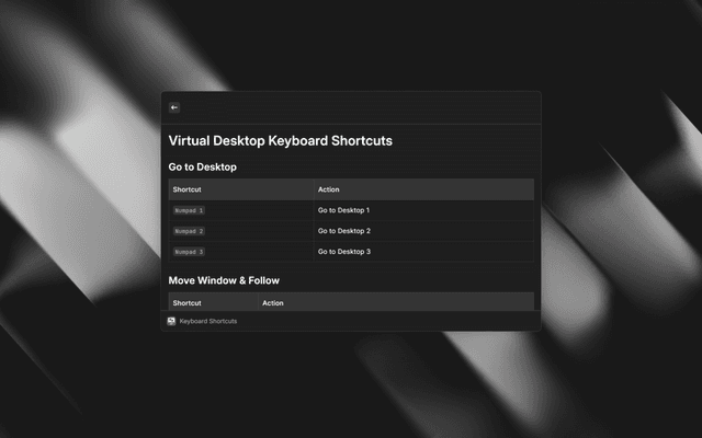 Numpad 4-6Move window to Desktop 1-3 & follow