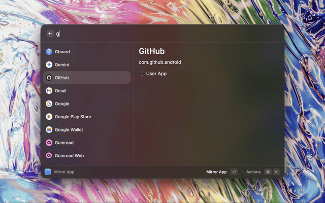 tell application "AirSync" to get status - Get device status (returns JSON)tell application "AirSync" to disconnect - Disconnect from devicetell application "AirSync" to reconnect - Reconnect to devicetell application "AirSync" to connect adb - Connect via ADBtell application "AirSync" to get notifications - Get notifications (returns JSON array)tell application "AirSync" to notification action "id|action_name|reply_text" - Perform notification actiontell application "AirSync" to dismiss notification "id" - Dismiss notificationtell application "AirSync" to get media - Get media info (returns JSON)tell application "AirSync" to media control "toggle" - Play/pausetell application "AirSync" to media control "next" - Next tracktell application "AirSync" to media control "previous" - Previous tracktell application "AirSync" to media control "like" - Like/unlike tracktell application "AirSync" to launch mirroring - Launch full device mirroringtell application "AirSync" to desktop mode - Launch desktop modetell application "AirSync" to get apps - Get list of apps (returns JSON)tell application "AirSync" to mirror app "package_name" - Mirror specific appnpm run dev - Run in development mode with Raycastnpm run build - Build the extensionnpm run lint - Lint the codenpm run fix-lint - Fix linting issuesMIT License - see LICENSE file for details.