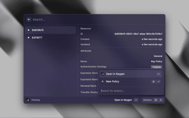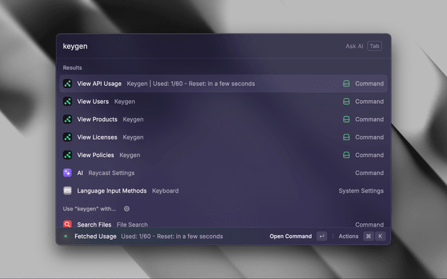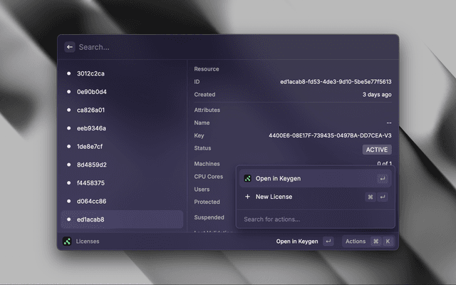 This is a Raycast extension for Keygen - Open, enterprise-grade licensing & distribution. With this extension you can: