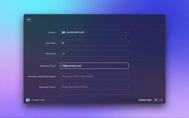 With this extension, you can quickly add or delete domains from your Purelymail account, create or delete users for your domains, create or delete Routing Rules, create or delete app passwords and Check Account Credit.