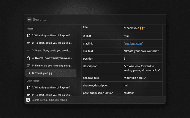 This is a Raycast extension for Youform - The most affordable Typeform alternative. With this extension you can easily view your forms, their blocks and submissions.