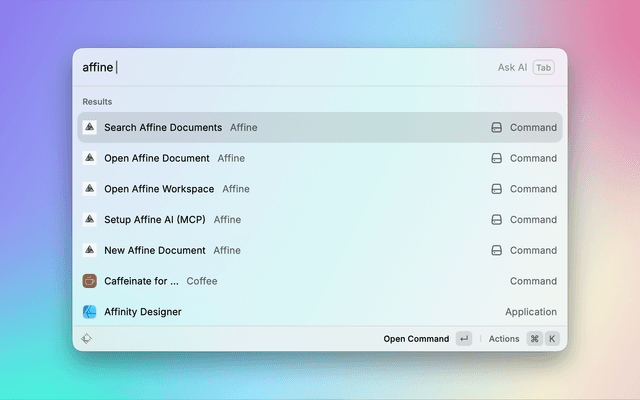 - New AFFiNE Document – Open AFFiNE in the browser (optionally in a specific workspace).